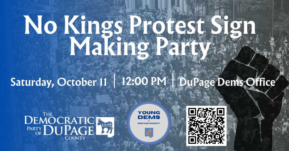 No Kings Protest Sign Making Party Cohosted by the Young Democrats of DuPage County Saturday, October 11 | 12:00 - 3:00 PM | DuPage Dems Office | Carol Stream |