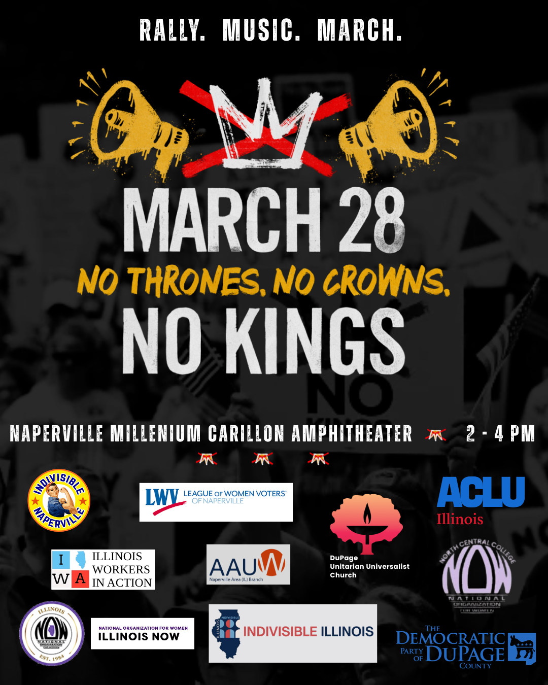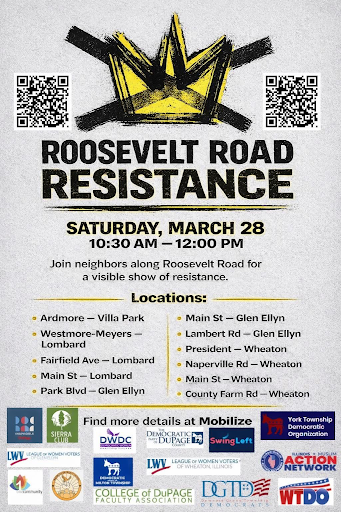 | Roosevelt Road Resistance | 10:30 AM – 12:00 PM | Multiple Locations in Glen Ellyn, Lombard, Wheaton, and Villa Park Naperville | 2:00 – 4:00 PM | Millennium Carillon Lisle | 11:00 AM – 12:00 PM | Ogden Ave and Karns Rd Addison | 11:00 AM – 12:30pm | John F Kennedy Drive & West Lake Street Aurora | 1:00 – 3:00 PM | McCarty Park Bartlett | 11:00 AM – 1:00 PM | Bartlett Veterans Memorial Elmhurst | 1:30 – 3:00 PM | Elmhurst City Hall Downers Grove | 1:00 – 3:00 PM | Main and Ogden Oak Brook | 2:00 – 4:00 PM | 1111 W 22nd St Chicago - Loop | 1:30 – 4:30 PM | Grant Park Schaumburg | 10:00 AM – 12:00 PM | Clocktower - Roselle and Schaumburg Rd South Elgin | 11:00 AM - 1:00 PM | 622 Randall Rd Elk Grove Village | 3:00 – 5:00 PM | Rotary Green Virtual Protest | 3:00 - 5:00 PM Central time |
